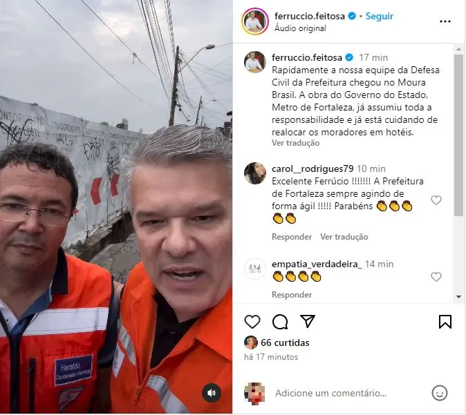 "Nós estamos no Moura Brasil neste exato momento, onde a Defesa Civil prontamente identificou uma situação grave devido à obra que está ocorrendo do Metrô de Fortaleza e comprometeu, com as chuvas, mais ou menos dez residências", disse Ferrucio Feitosa, em vídeo publicado na rede social, ao lado do coordenador de proteção e defesa civil Heraldo Maia Pacheco.