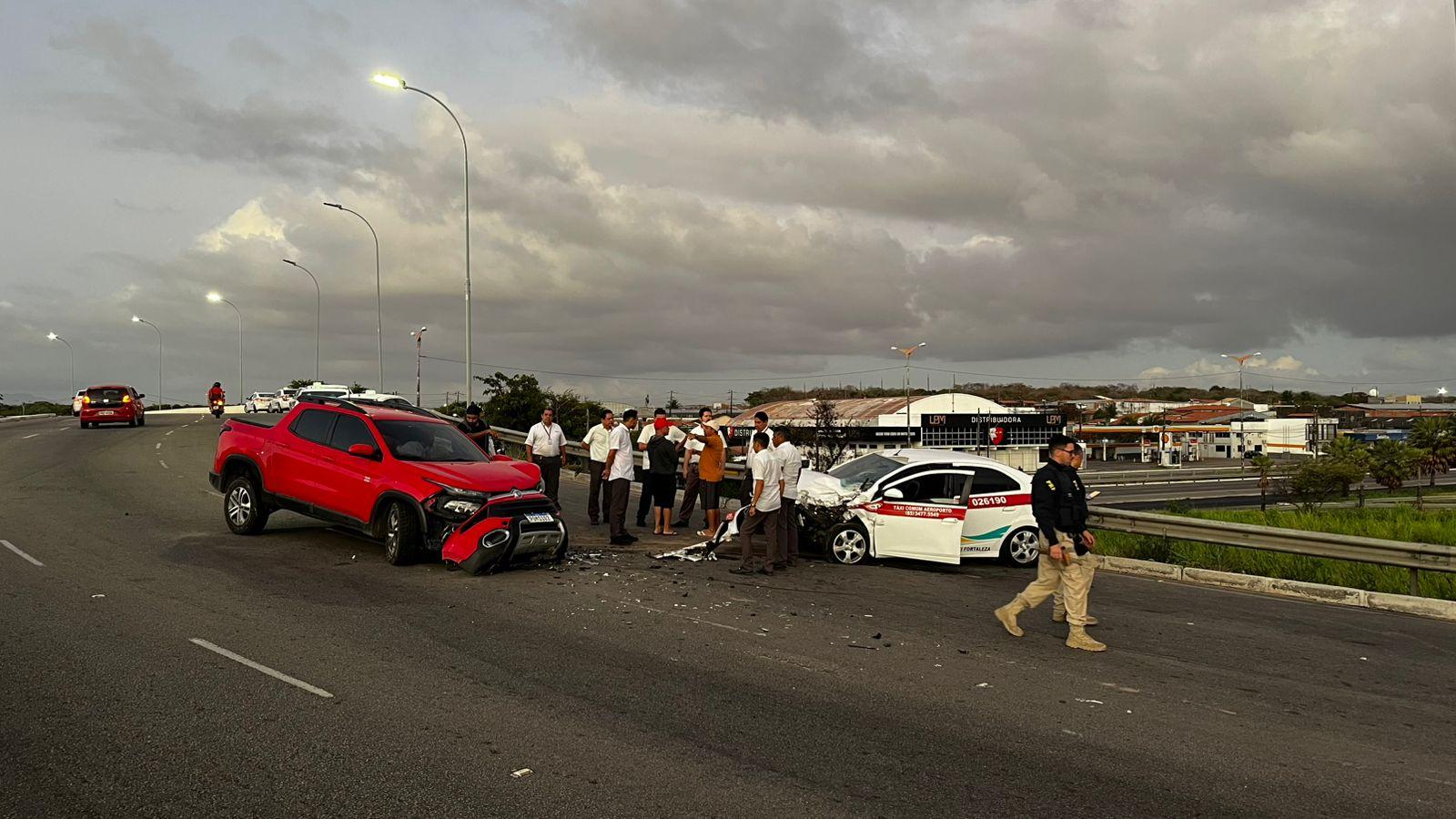 Um acidente envolvendo um carro e um táxi deixou duas pessoas feridas, na madrugada desta sexta-feira (29), em cima do viaduto da avenida Raul Barbosa, em Fortaleza. Informações preliminares da Polícia Rodoviária Federal (PRF) indicam que uma das vítimas teve lesões graves, enquanto a outra leves.