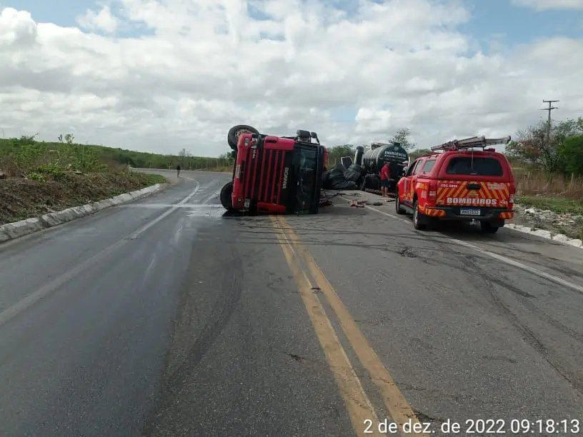 O bloqueio acontece no km 202, no sentido capital-interior, devido a um dos caminhões estar tombado na rodovia. Uma equipe da Polícia Rodoviaria Federal (PRF) está no local realizando o controle de tráfego.