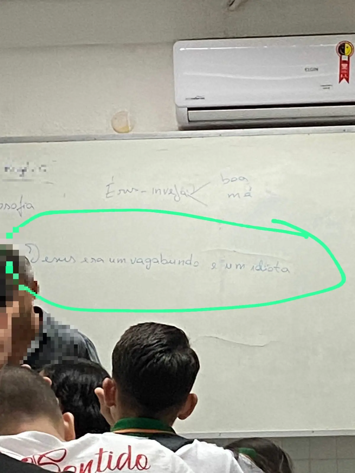 Alunos fotografaram o quadro onde estava grafado “Jesus era um vagabundo e um idiota” durante uma aula. A frase, segundo a denúncia, foi escrita pelo professor de Filosofia da instituição.