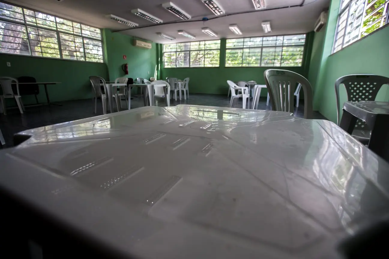Sem restaurante universitário, os alunos almoçavam marmitas distribuídas pela instituição na quadra esportiva, mas deixaram o espaço depois de parte da coberta cair com as chuvas no início deste ano – as refeições são feitas nos corredores desde então.