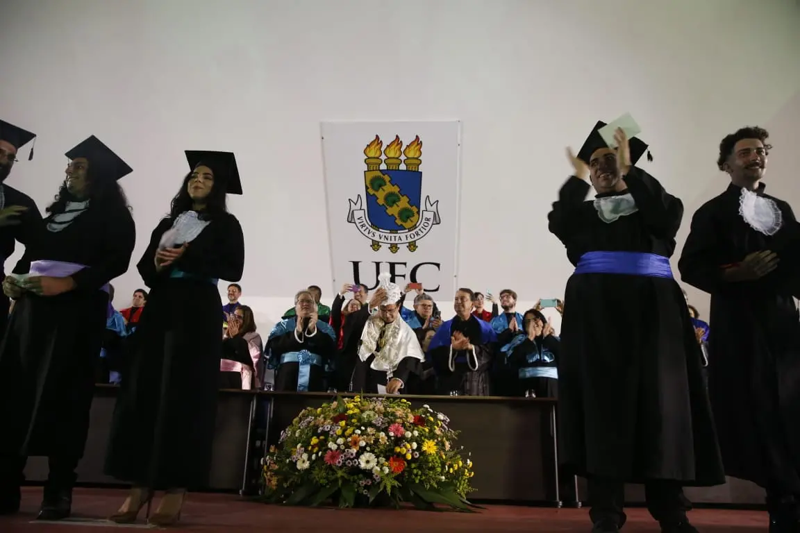Mais de mil alunos formados pela Universidade Federal do Ceará (UFC) participaram da colação de grau da instituição na noite desta quarta-feira (4). A solenidade especial reuniu cerca de 55 concludentes e 1.138 egressos, estudantes que estão colando grau de forma simbólica, pois se formaram durante a pandemia.