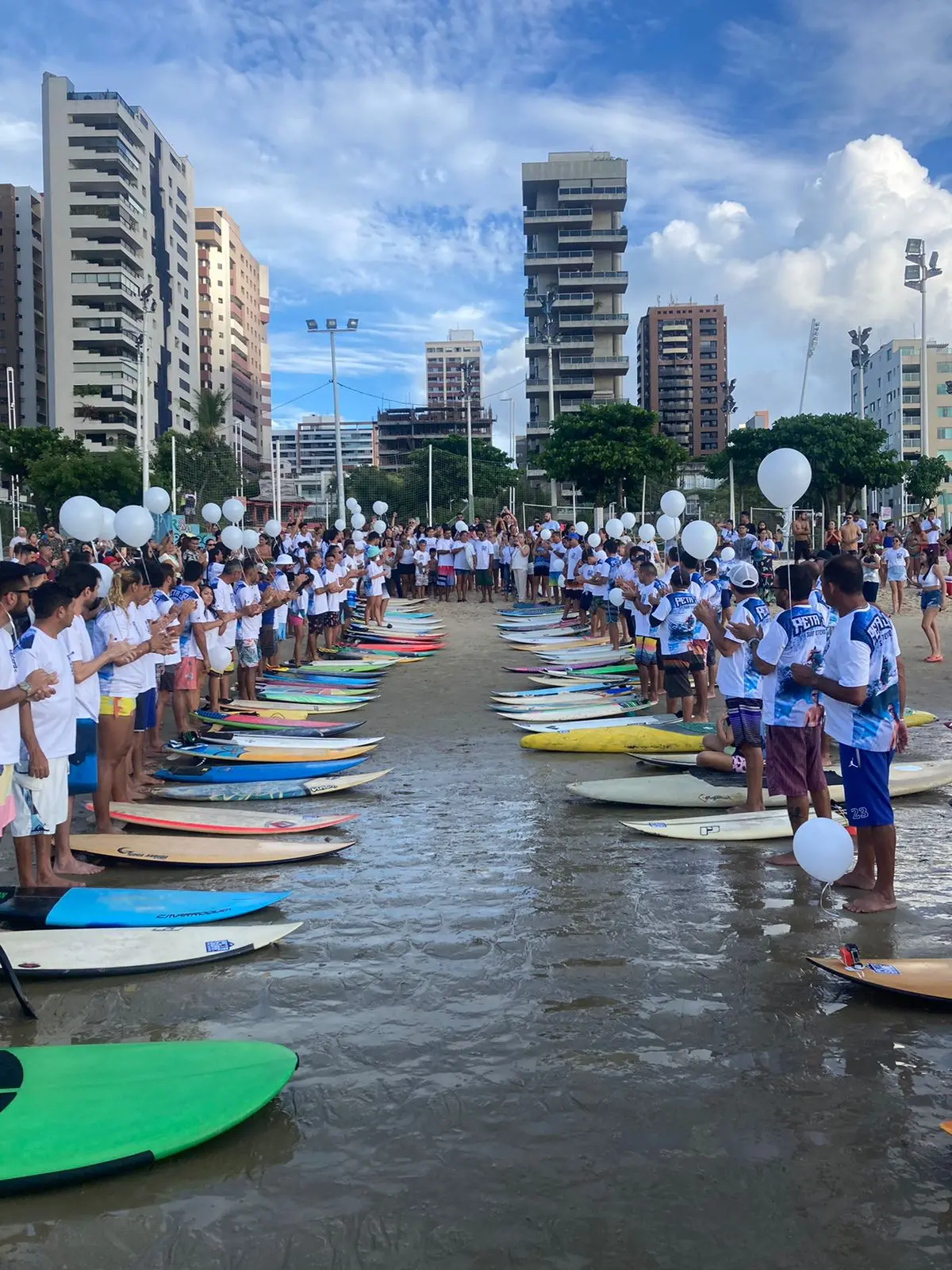 Na homenagem, os amigos estiveram presentes com pranchas de surf e balões na praia para lembrar de um dos lugares favoritos de Peta.
