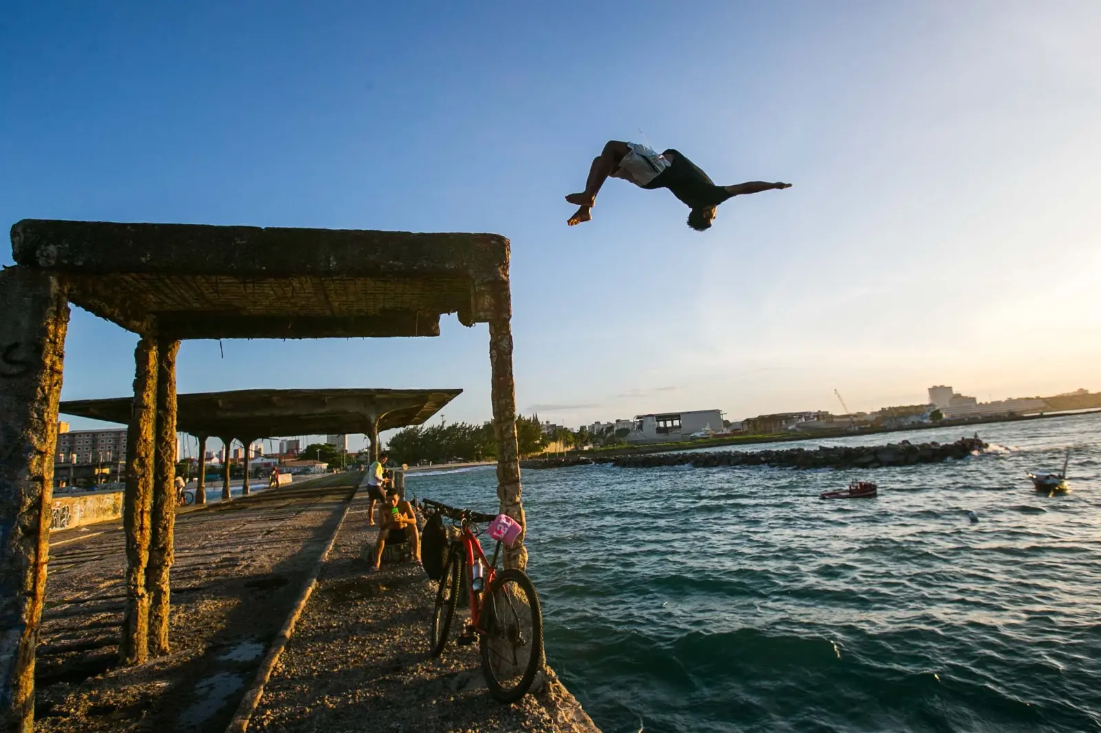 O estudante Jeferson Jerônimo, de 24 anos, é outro que também vai semanalmente para a praia do Poço da Draga. Diferente de Lorena, a motivação dele é justamente o salto da ponte. Ele reconhece a aventura não é segura para quem não conhece a região, tendo em vista que há partes do mar com mais ondas e outras mais tranquilas.