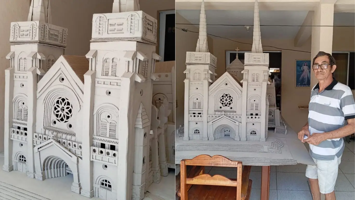 O aposentado Josemar Saraiva, de 65 anos, construiu uma réplica rica em detalhes da Catedral metropolitana de Fortaleza utilizando papelão. A obra impressionou usuários nas redes sociais após a nora dele, Daniele Ribeiro, publicar vídeos do processo no TikTok.