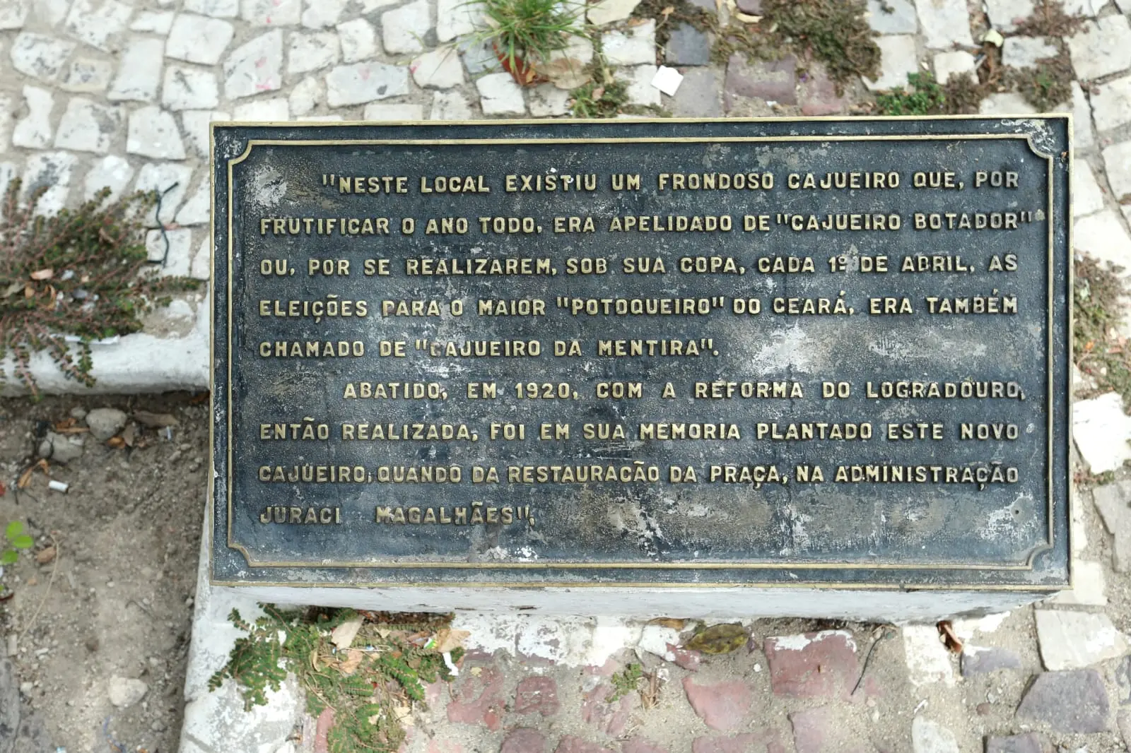"Uma árvore muito famosa era o cajueiro da mentira, onde se estabeleceu o hábito de, no dia 1º de abril, fazer o concurso de maior 'potoqueiro' do Ceará. Derrubaram em uma das reformas da praça, e quando o Fausto Nilo fez outra reforma, foi plantado outro cajueiro no lugar", contextualiza P.A.