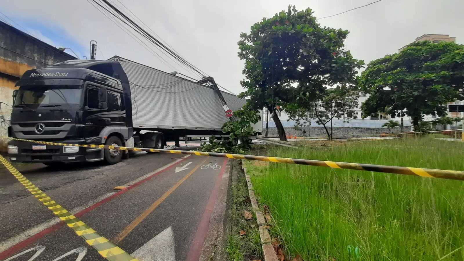 Um caminhão arrastou a fiação e bloqueou parte da Avenida Marechal Deodoro, no Bairro Benfica, em Fortaleza, nesta quinta-feira (7). Um poste chegou a cair e a região ficou parcialmente sem energia elétrica.
