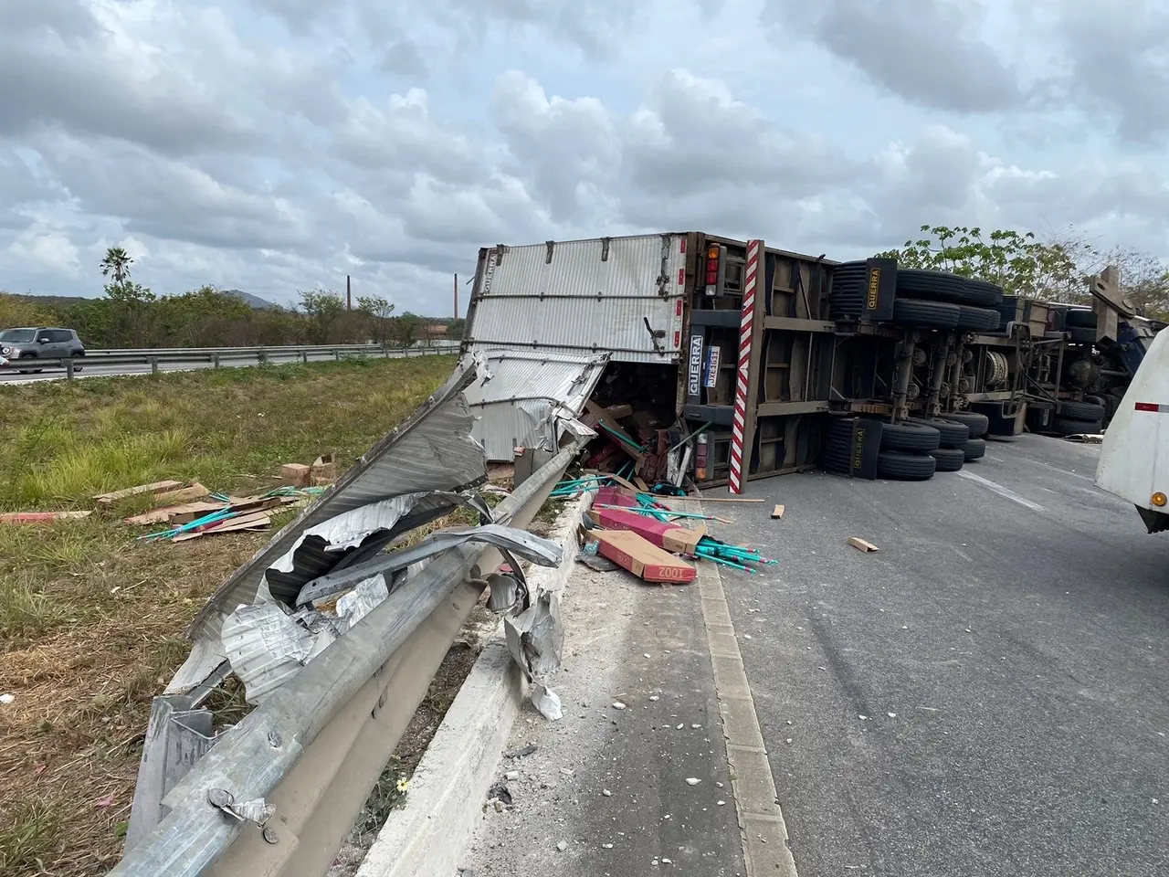 A PRF acionou a empresa dona do caminhão para retirar a carga e o veículo da via.