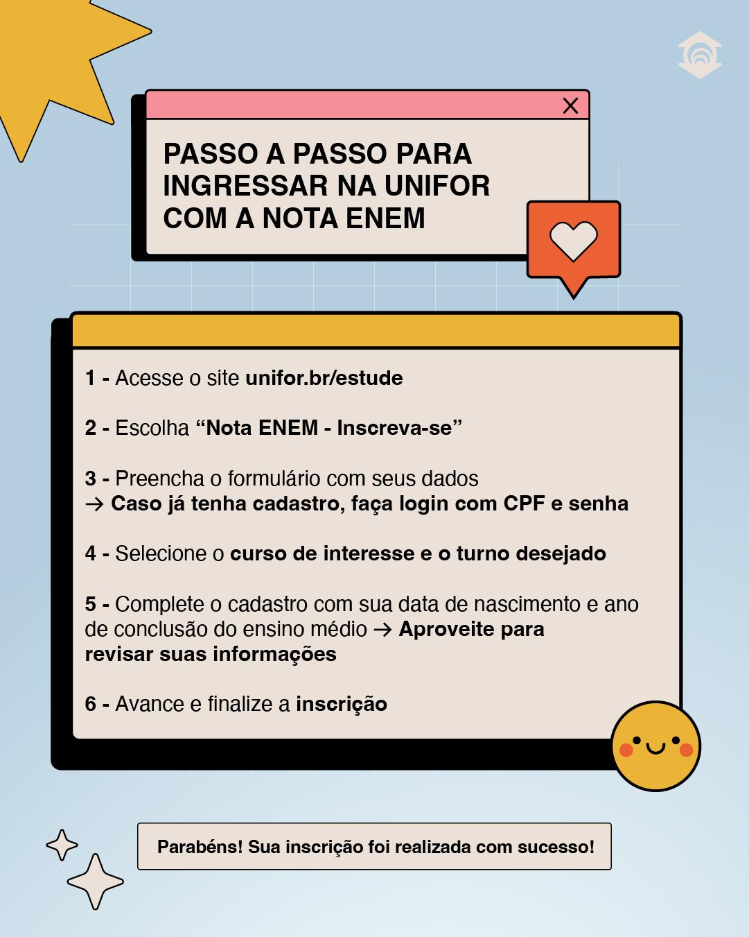 Depois da inscrição, a Unifor realiza uma verificação da nota do Enem, em parceria com o Instituto Nacional de Estudos e Pesquisas Educacionais Anísio Teixeira (Inep).