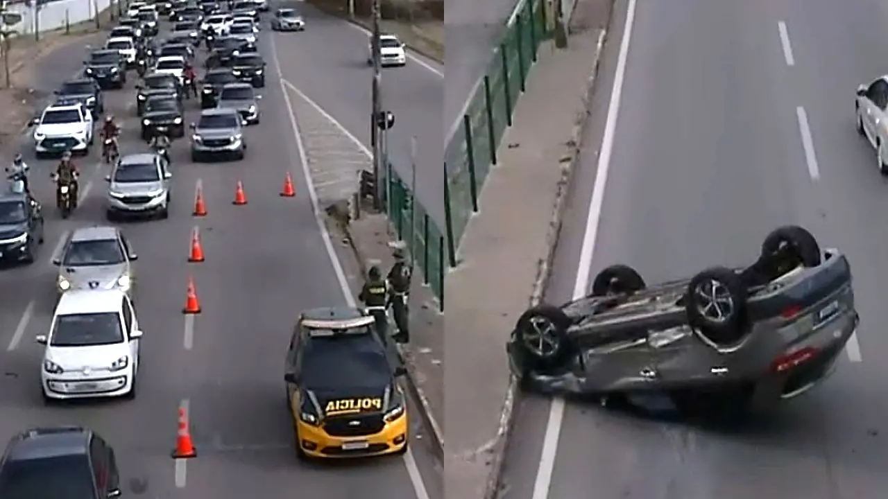 O carro capotado bloqueou parcialmente o tráfego no sentido norte–sul, deixando apenas duas faixas liberadas.