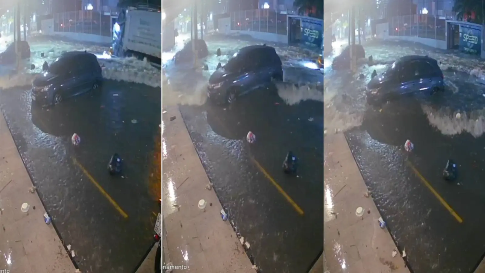 No vídeo, é possível observar os veículos estacionados na lateral da via, que está encoberta pelo volume d'água. Quando um caminhão de coleta de lixo passa pelo local, uma onda se forma, fazendo os automóveis flutuarem parcialmente. (Assista abaixo)