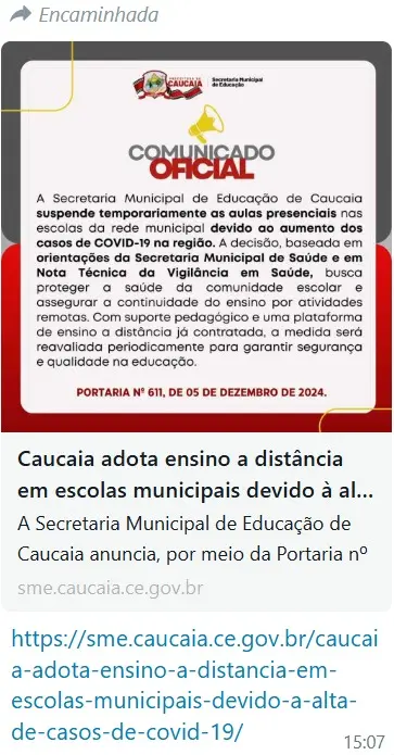 Segundo o documento, a decisão se baseia num alerta da Secretaria Municipal de Saúde de Caucaia, emitido em 4 de dezembro de 2024, sobre o cenário da Covid-19 na cidade, “com especial preocupação sobre os ambientes educacionais da rede pública municipal”.