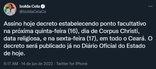 A governadora Izolda Cela decretou, na manhã desta terça-feira (14), ponto facultativo em todo o Ceará no dia de Corpus Christi, data religiosa celebrada na quinta-feira (16), assim como na sexta-feira (17).