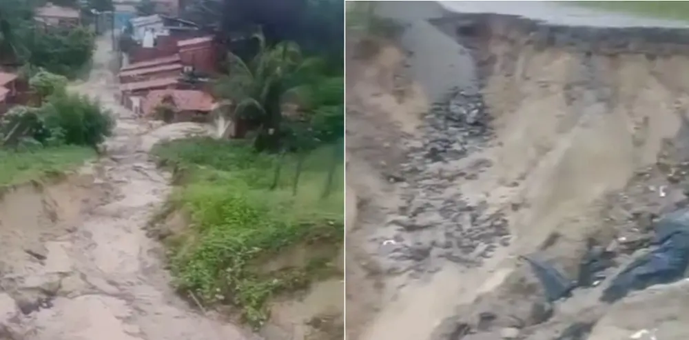 Imagens que circulam nas redes sociais evidenciam o tamanho do estrago na via de calçamento. Com a erosão, a rua ficou totalmente desnivelada e intrafegável.