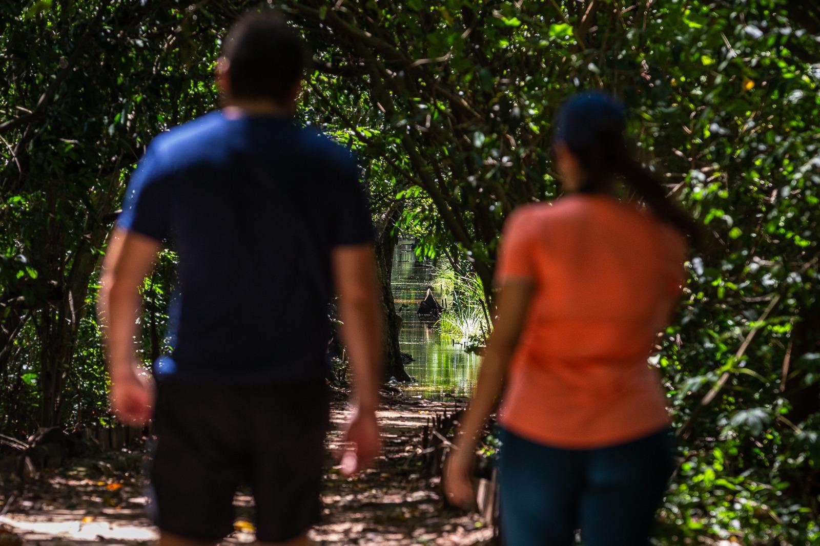 "A gente vem uma vez por semana para sair um pouco da rotina e trazer o Arturzinho para sair um pouco do celular. Quando chove, a gente sabe que alaga e é ter paciência para fazer a trilha novamente", comenta ao lado do filho que esqueceu dos peixes ao ver um caranguejo que cruzou o caminho.