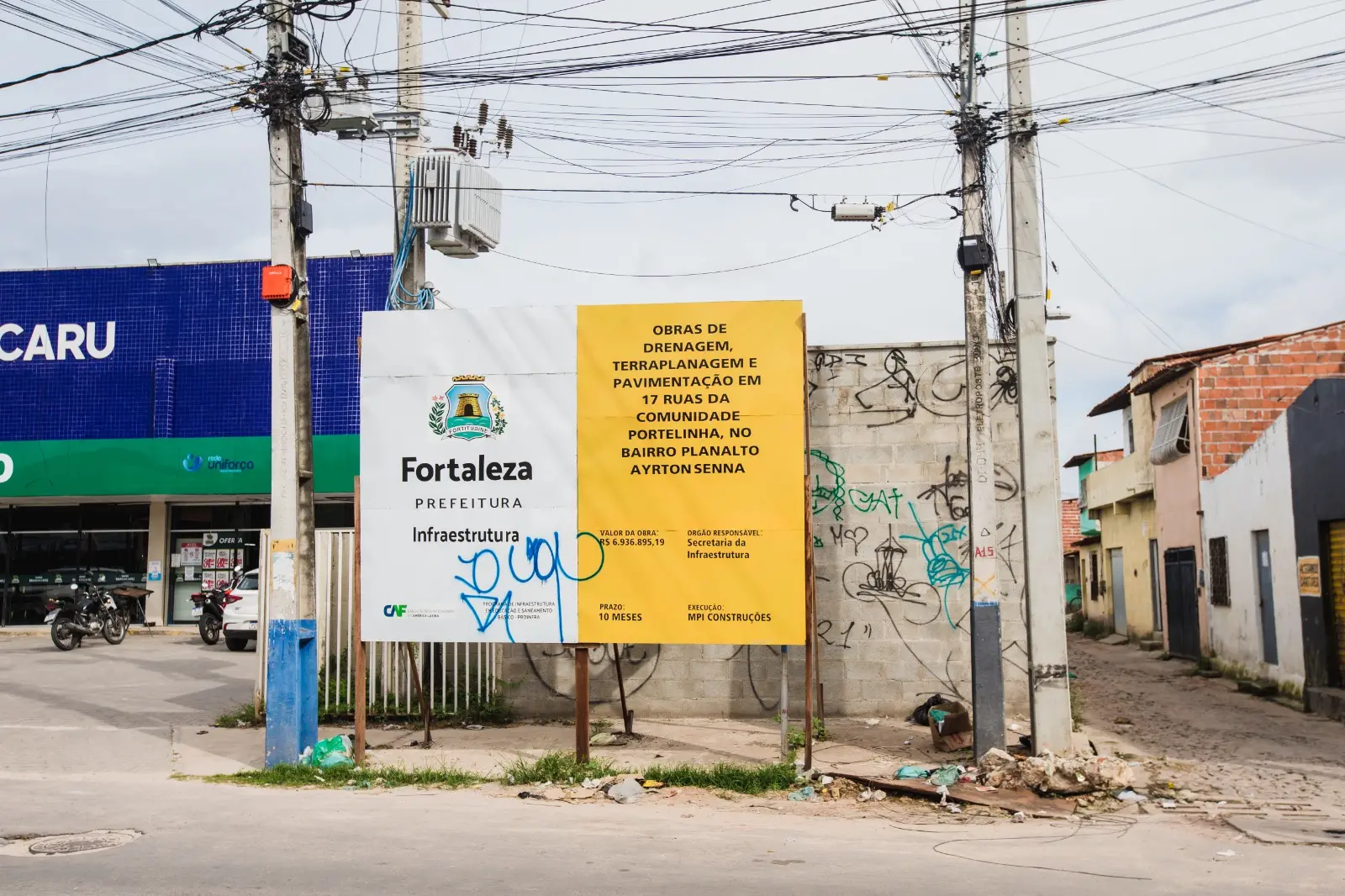 Na esquina da rua de Gleison está uma placa que indica obras de urbanização e infraestrutura viária em 17 ruas da comunidade Portelinha.