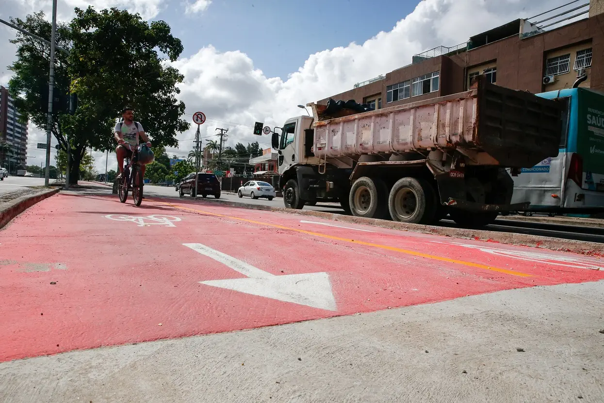 Outra alteração benéfica, segundo ele, foi o nivelamento de trechos com lombadas: “se você viesse desatento, poderia até cair”. Para ficar ainda melhor, Cleyrton acredita que toda a ciclovia deveria ser pintada na cor vermelha, que indica espaço para ciclistas, mas a marcação só foi feita perto dos cruzamentos.