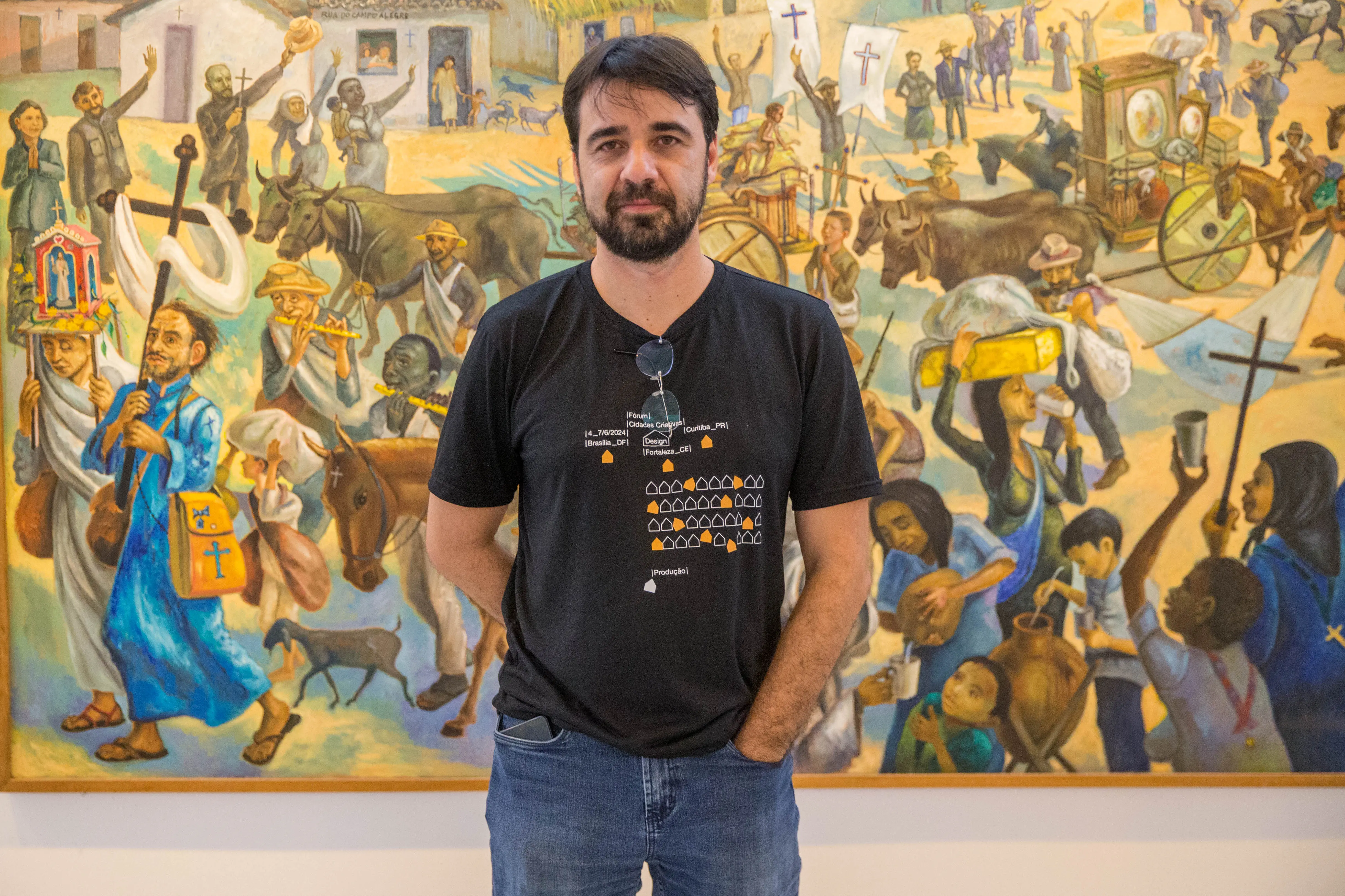 “A peça tátil vai servir muito mais para eu entender a geometria daquela obra, as posições. Mas uma descrição subjetiva — falar sobre as cores, sobre coisas mais sensíveis, falar que o olhar dessas crianças é de apreensão —, isso eu não vou conseguir perceber tão bem. Mas a audiodescrição fala sobre isso e eu venho, toco e faço uma associação. Uma complementa a outra”, explica Roberto César Vieira, professor do curso de Design da UFC.