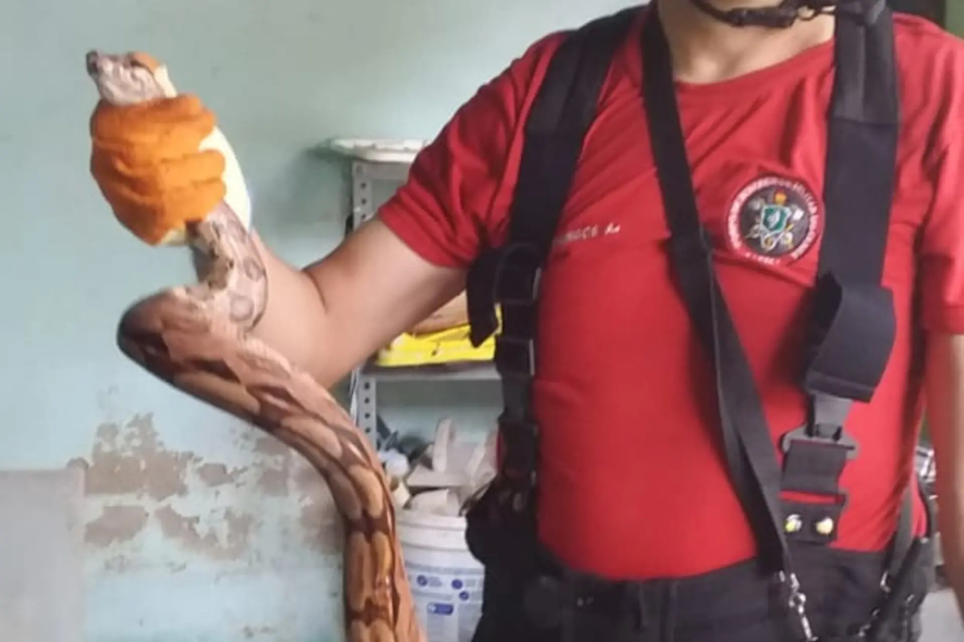 Para realizar a retirada da serpente, os agentes do Corpo de Bombeiros utilizaram uma escada e a pinça própria para captura de répteis. O animal estava calmo e aparentava ter se alimentado recentemente.