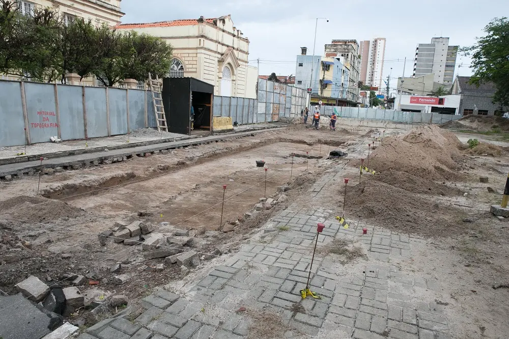 Na construção da Linha Leste do Metrô, no Centro, nas proximidades da Escola Justiniano de Serpa, os tapumes envolvem um dos sítios arqueológicos identificados em 2021 em Fortaleza. A intervenção no local é para estruturação de um poço de ventilação do metrô. Desde a identificação do sítio, no segundo semestre de 2021, a obra segue parada.