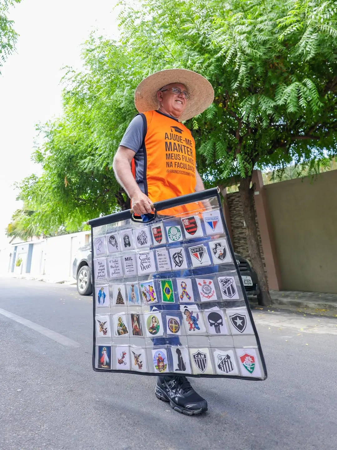 O colete com a frase “Ajude-me a manter meus filhos na faculdade” guia o cearense Francisco Camelo, conhecido como 'Francisco da Merenda', na venda de adesivos em diversas cidades do Nordeste.