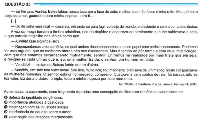 Justamente questionando o casamento, a questão pedia qual concepção de literatura romântica era evidenciada no fragmento do livro escolhido. A maioria dos gabaritos extraoficiais indica a opção que trata da "interferência da riqueza sobre o amor".