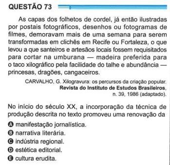 Então, o Enem questiona: o que foi renovada, no início do séxulo XX, com a incorporação da xilogravura? Conforme os gabaritos extraoficiais, seria a "estética editorial". Contudo, a resposta não é unânime e é preciso aguardar o gabarito oficial do Inep.