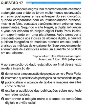 A questão perguntou qual era a intenção de se apresentar o dado estatístico ao fim do texto. A resposta, indicam os gabaritos extraoficiais, está em "comprovar a relação entre o alcance de conteúdos digitais e o viés racial".