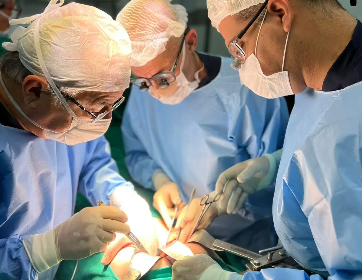 Para o transplante intervivos, foram necessárias duas equipes cirúrgicas trabalhando quase simultaneamente em salas de cirurgias distintas e contíguas.