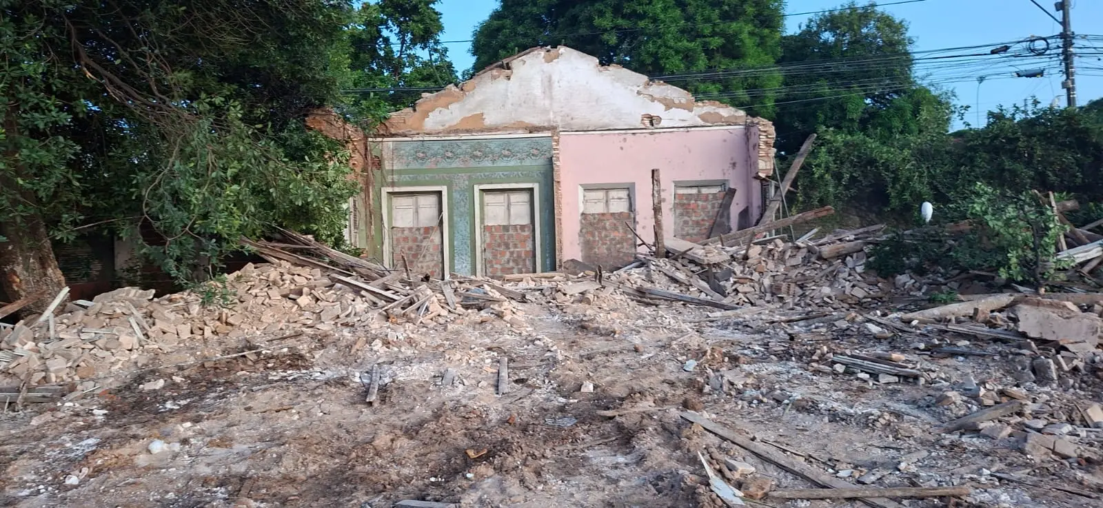 Esse prédio, situado em área de proteção patrimonial, já apresentava avançado estado de demolição quando as equipes chegaram ao local. Da estrutura, restava preservada apenas a parte da fachada frontal da edificação.