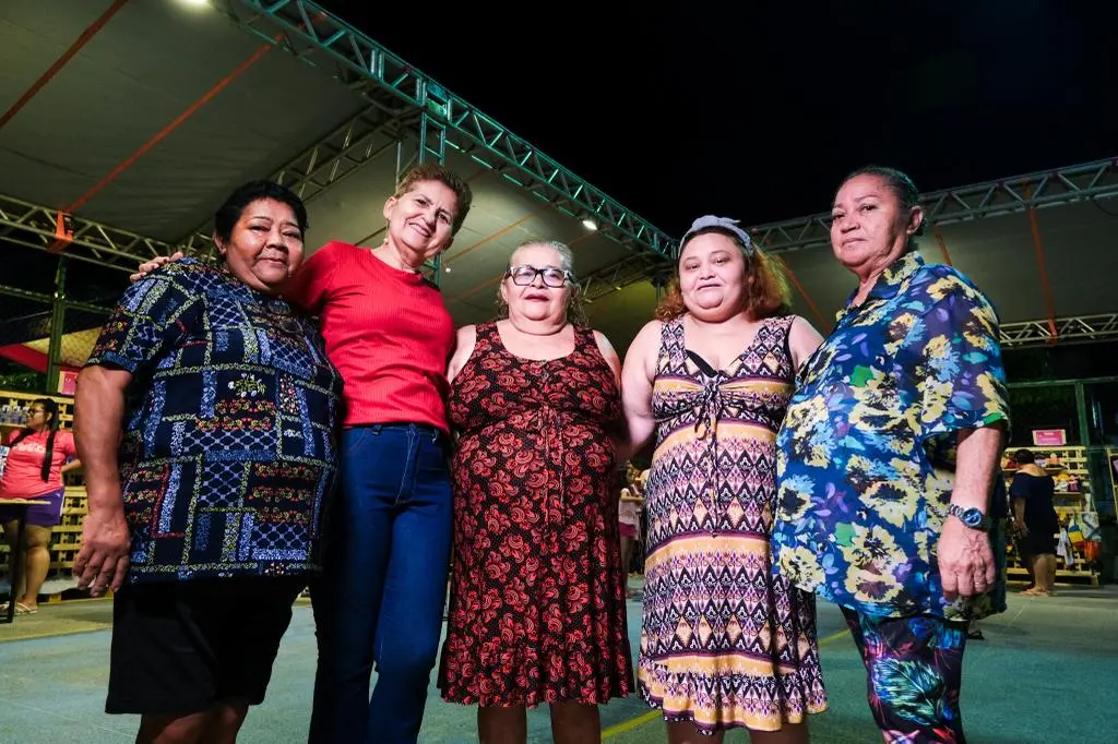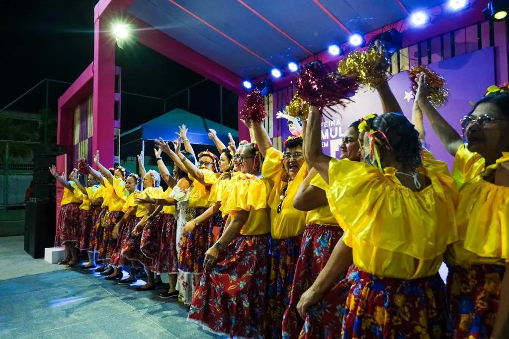 Em meio ao movimento de mulheres empreendedoras, numa troca de conhecimento e experiências, o palco da Feira Mulher em Foco também ecoa arte. Logo no início da noite, idosas da comunidade, com saias floridas, camisas amarelas e coreografia ensaiada, resgatam clássicos da música regional.
