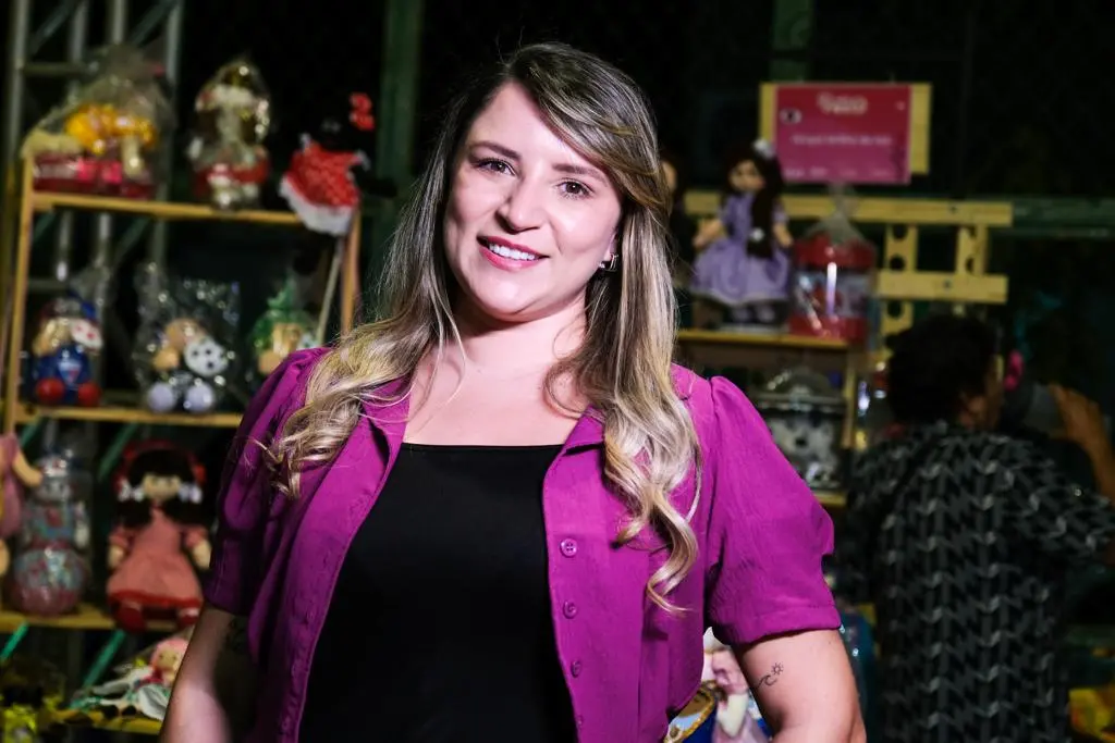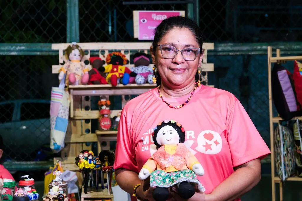 Nádia Tais, 31, expõe os produtos feitos em parceria com outras mulheres que compartilham as vivências parecidas. Na Feira Mulher em Foco, ela representa a iniciativa Arte em Cadeia com peças de vestuário, almofadas, bolsas e bonequinhas.