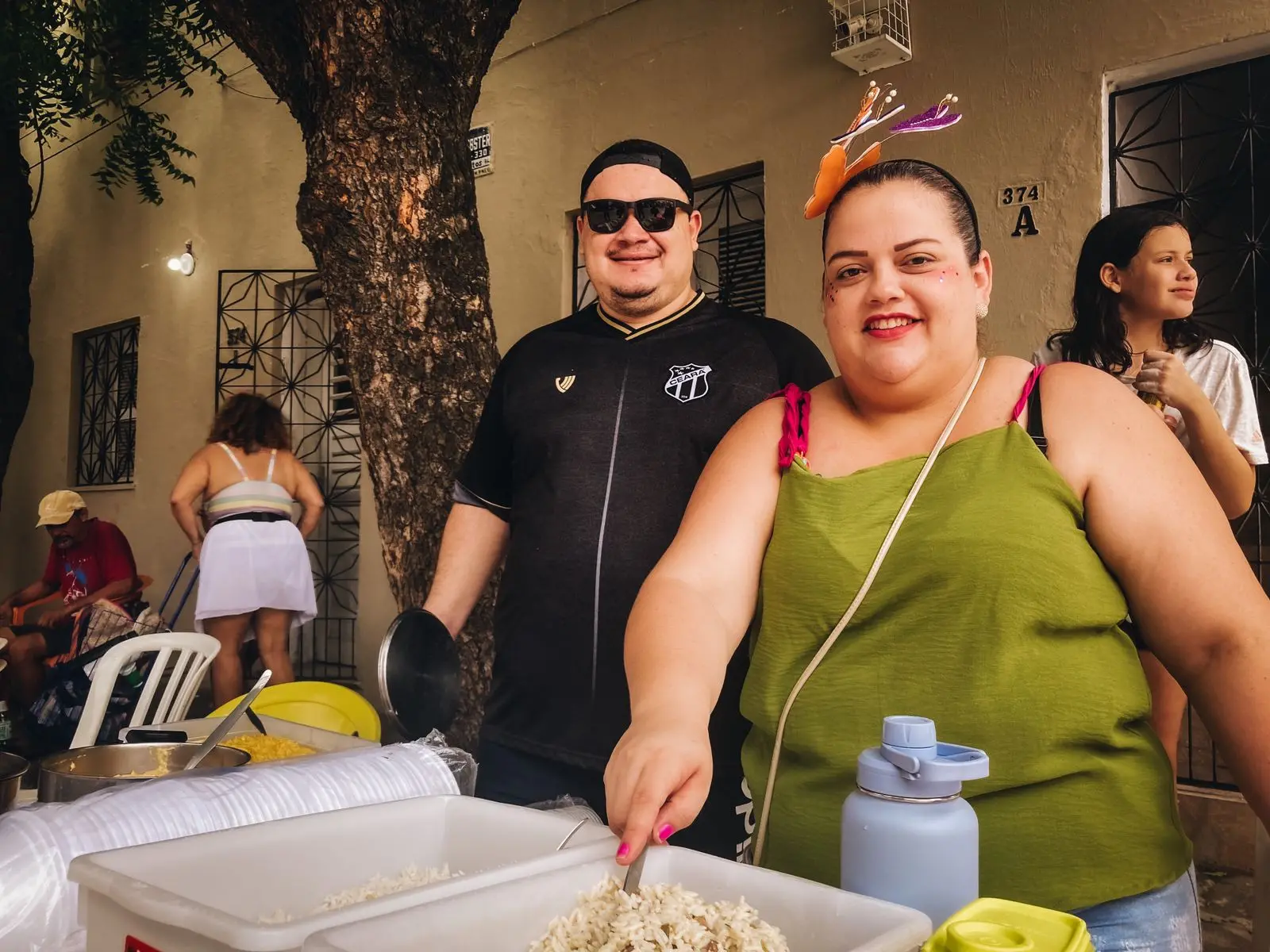 Também na Gentilândia estava o casal Emanuel Sena, 35, e Ivna de Fátima, 35. Vendendo o tradicional pratinho pela segunda vez no Carnaval, eles aproveitam a data para fazer uma renda extra, já que, fora das festividades, os dois possuem emprego fixo: ele é portuário e ela trabalha como atendente.