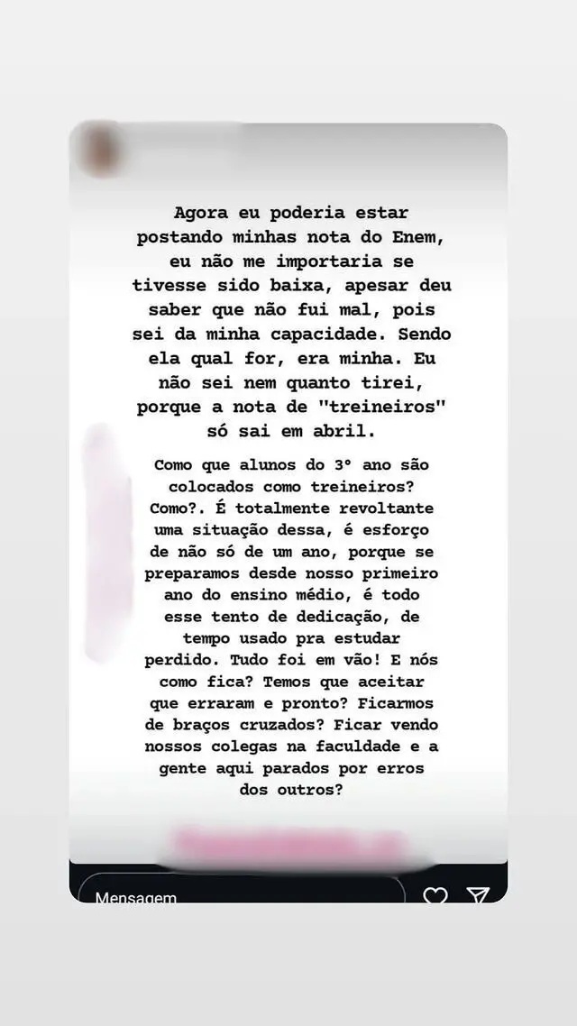 Ela, que estuda à noite, das 18h15 às 21h30, e contratou um cursinho online em 2024 para auxiliar nos estudos de preparação para o Enem, relatou que ficou bastante frustrada e indignada com a situação. A estudante-trabalhadora, já que divide a rotina entre a escola e o emprego em uma churrascaria, conta que sonha em ingressar no curso de Nutrição.