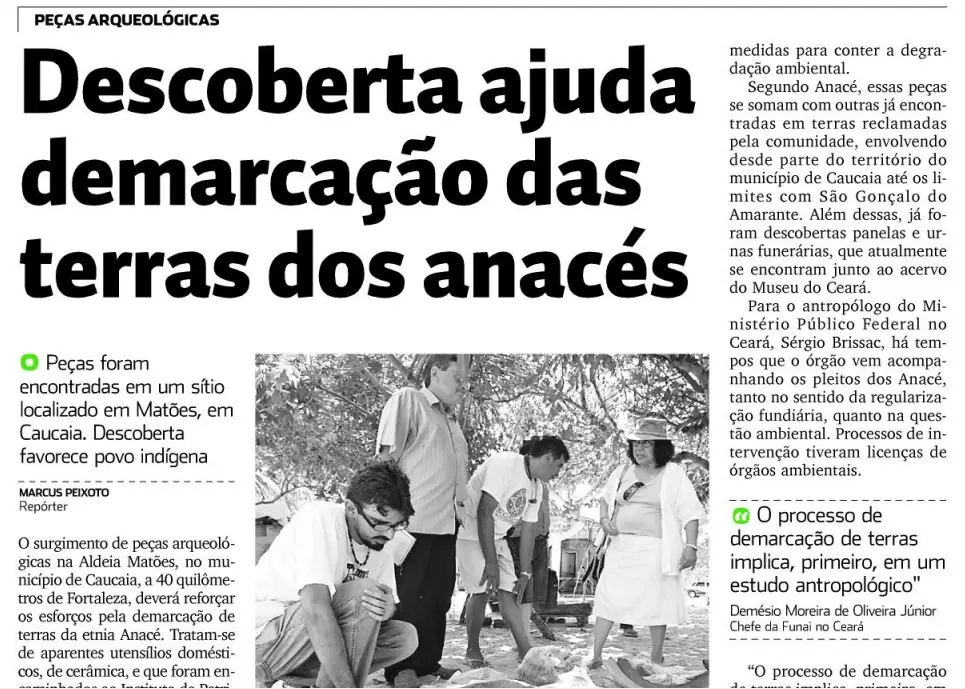 O cemitério do povo indígena Anacé (que significa “parente”, na língua tapuia) foi erguido, segundo lideranças dessa comunidade, em 1630, em Caucaia, Região Metroplitana de Fortaleza (RMF). Porém, o mesmo grupo foi vítima de um apagamento histórico e, ainda hoje, enfrenta dificuldades para ter sua identidade oficialmente reconhecida - inclusive para receber serviços básicos como educação, saúde, transporte e saneamento.