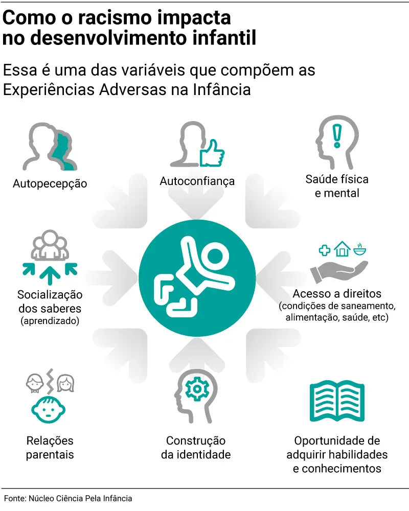 O racismo é uma forma de violência e promotor do estresse tóxico, aquela sensação de que a qualquer momento algo ruim pode acontecer e isso é nocivo para o desenvolvimento emocional