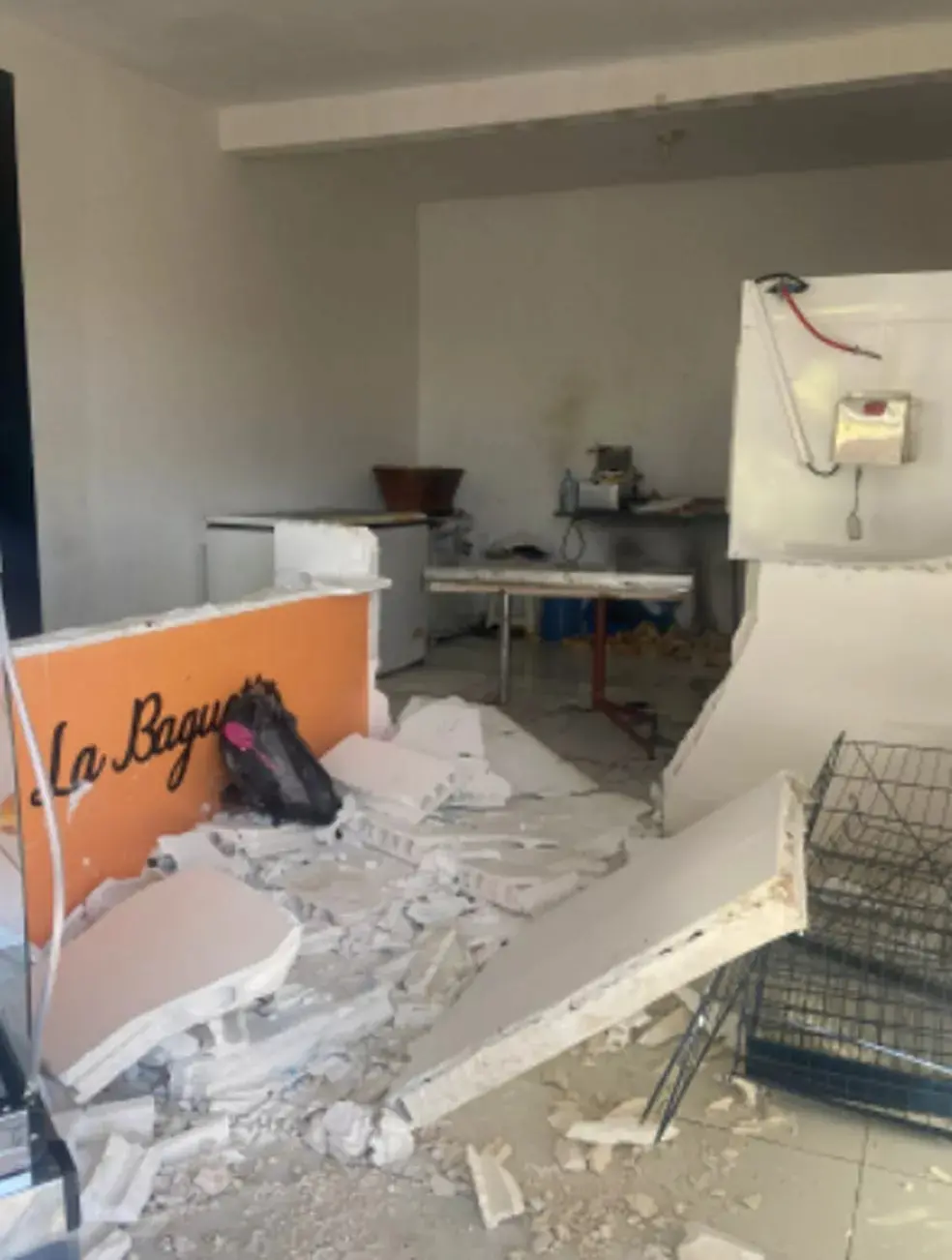 O estabelecimento teve o portão e o forro derrubados pela força da explosão, que também destruiu produtos expostos na vitrine.