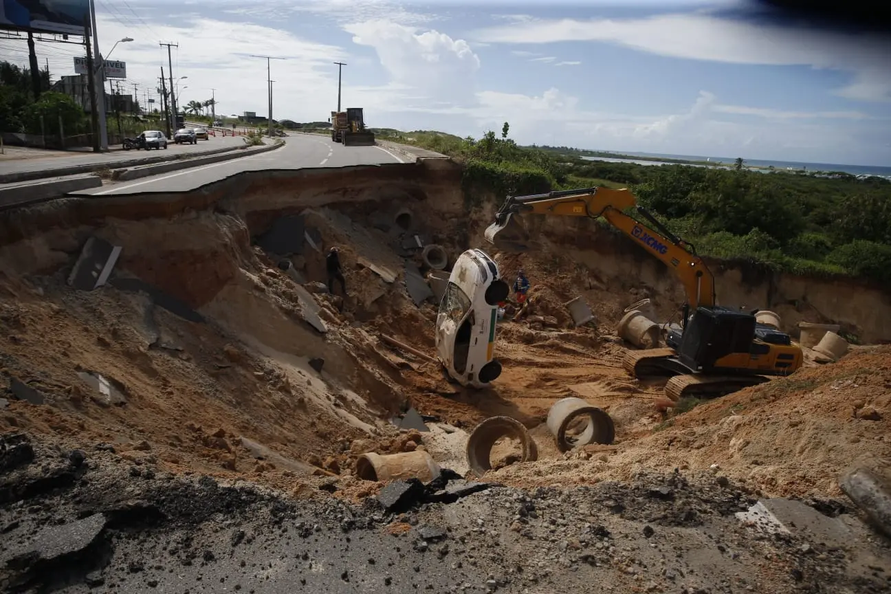 "A hipótese inicial foi uma falha na drenagem, que colapsou e acabou carregando o material. As equipes já começaram a atuar fazendo a recomposição do pavimento, mas o caso ainda está em investigação", disse Saullo Câmara sobre os levantamentos preliminares da SOP, após verificação e liberação da Perícia Forense no local.