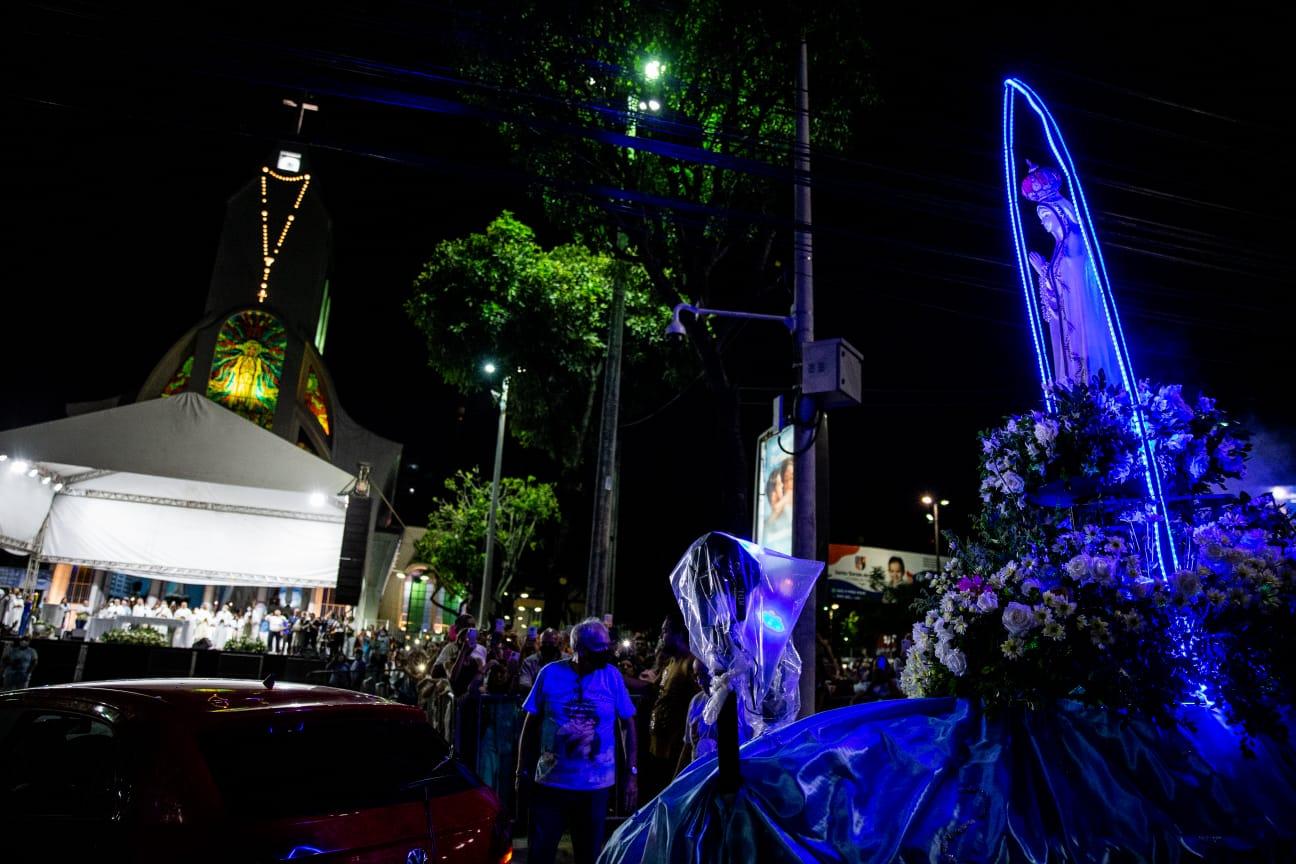 Após dois anos sem a procissão de Nossa Senhora de Fátima, fiéis voltaram às ruas de Fortaleza nesta sexta-feira, 13 de maio. Em caminhada entre a Igreja do Carmo, localizada no Centro, e o Santuário de Fátima, fizeram homenagem a ela.