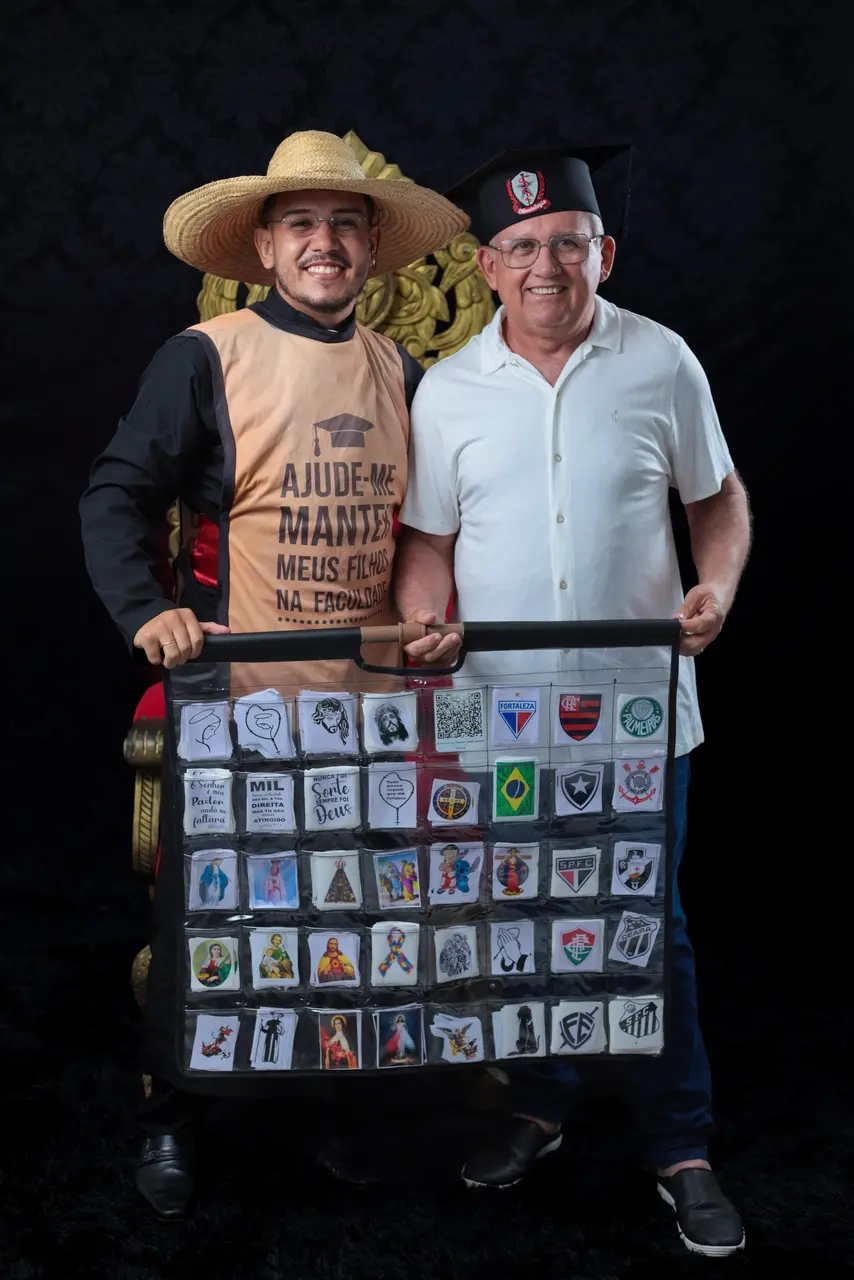 Ainda no momento das tradicionais fotos da formatura, pai e filho trocaram os chapéus. Matheus tirou o capelo, colocou no pai e vestiu o chapéu de palha usado diariamente para a venda dos adesivos.