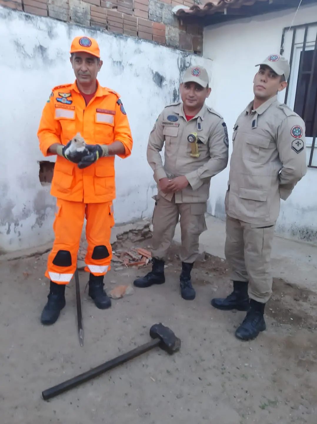 Uma filhote de gato foi resgatada pelo Corpo de Bombeiros no bairro Cacimbas, em Itapipoca, nesse domingo (20). Vitória, como é chamada pela tutora, estava presa entre duas paredes do imóvel onde vive.