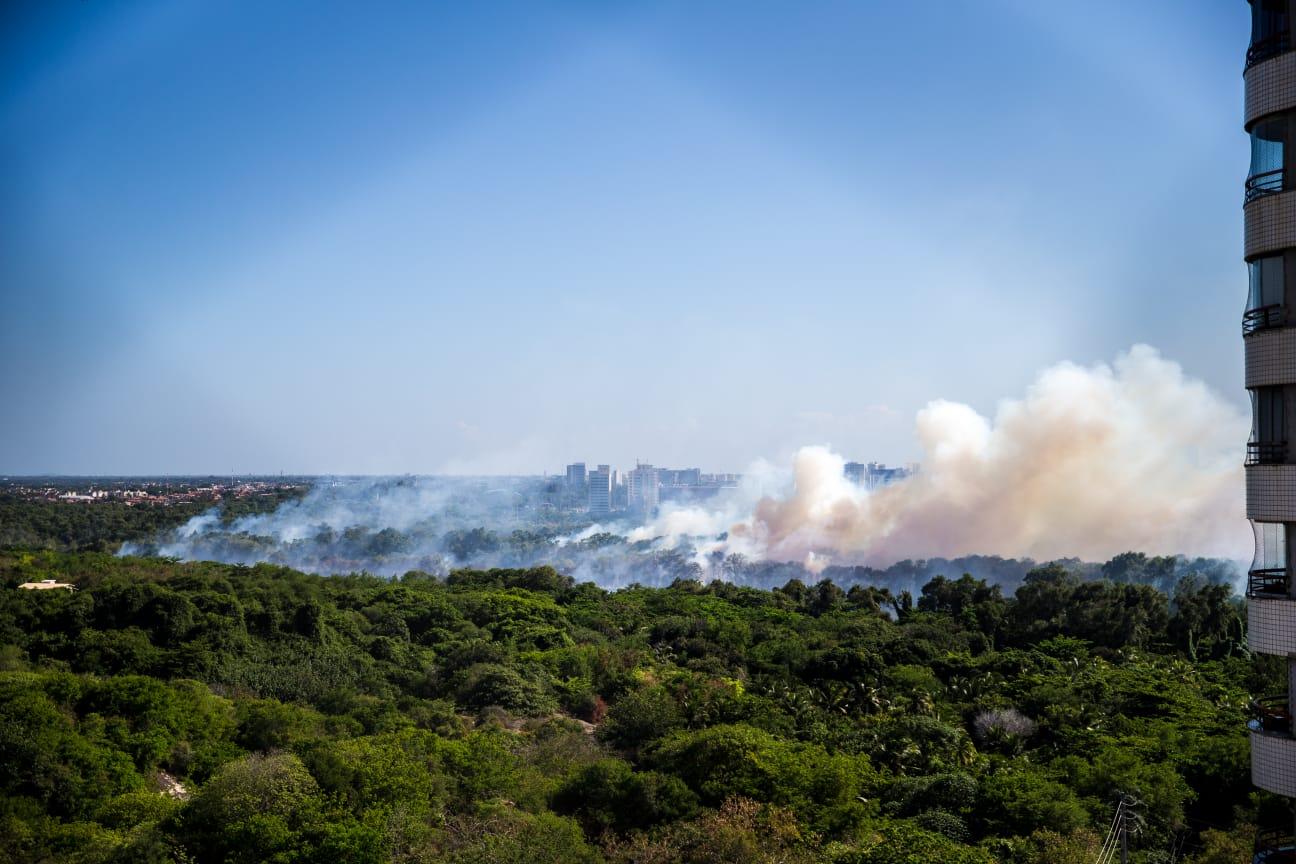 Uma área maior do que quatro campos de futebol foi consumida pelo incêndio no Parque Estadual do Cocó, em Fortaleza. Na tarde desta sexta-feira (19), a vegetação continua sendo queimada por uma espécie de fogo subterrâneo, dificultando o combate na área que de difícil acesso.