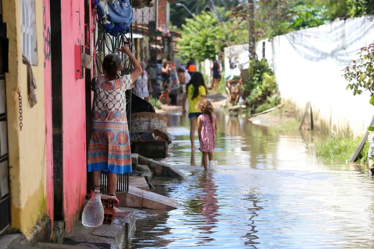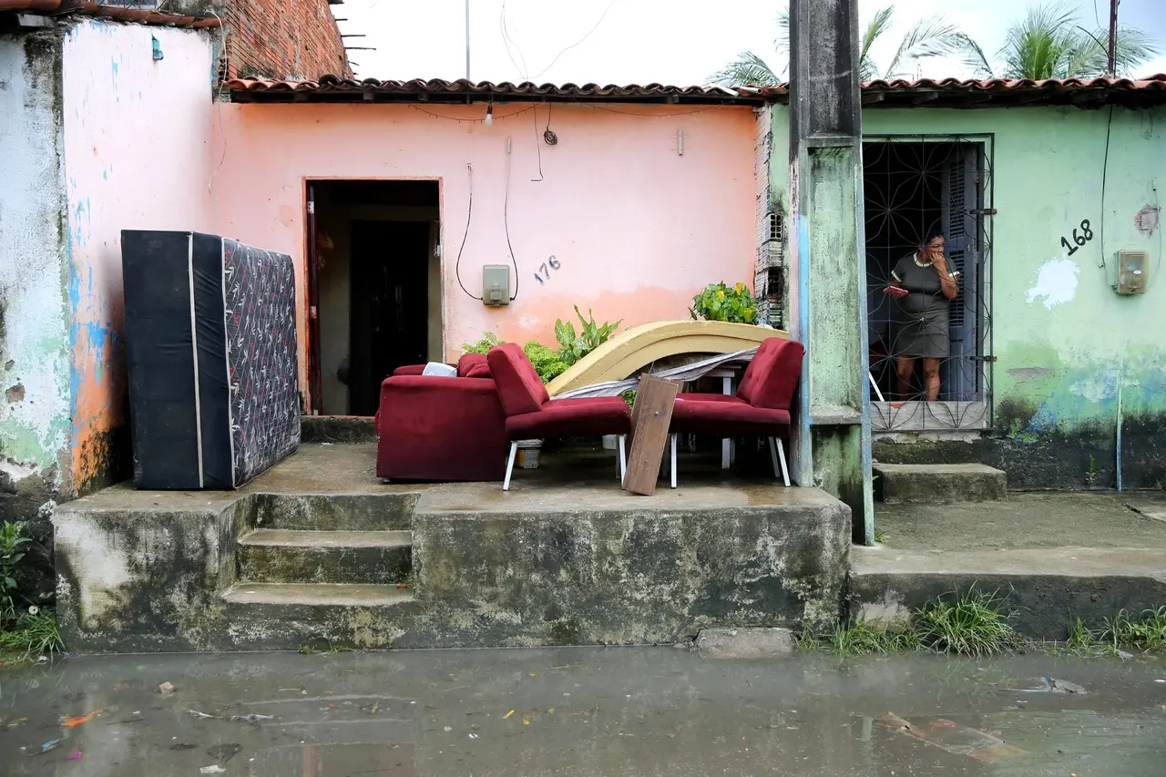 Em algumas ruas, as casas alicerçadas bem acima do nível do asfalto evidenciam que os alagamentos já fazem parte do cotidiano da população, mas nem mesmo as barreiras construídas foram suficientes para conter a força da chuva de 75 milímetros, que encheu e fez transbordar o Rio Maranguapinho, vizinho das comunidades.