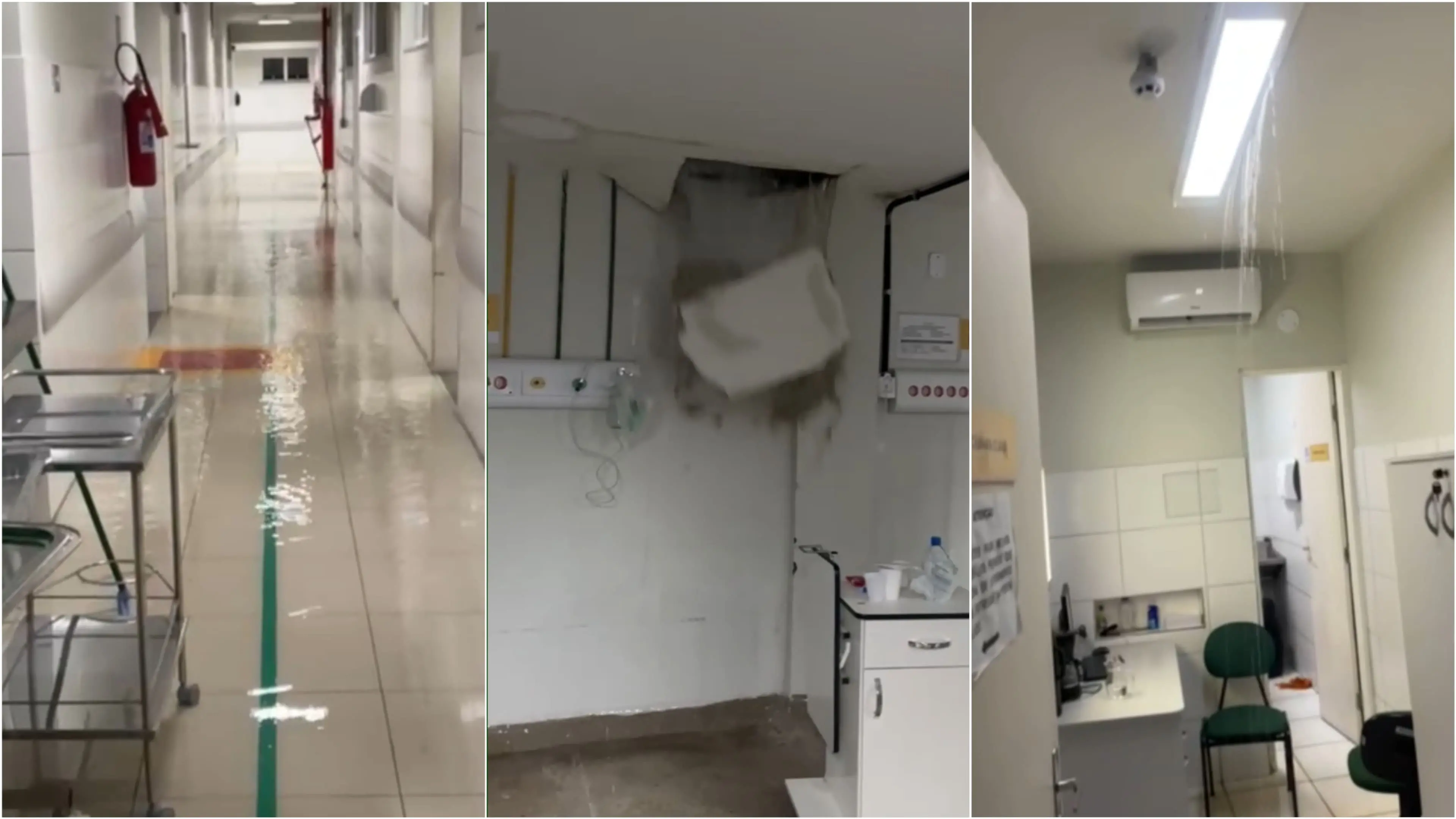 As imagens mostram ainda profissionais de saúde e pacientes andando em diferentes corredores alagados do hospital. A água também é vista saindo de lâmpadas e até mesmo de aparelhos de ar-condicionado.