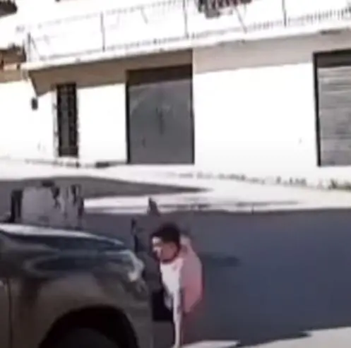 No entanto, o garoto acaba batendo o pneu da frente em uma motocicleta, perde o equilíbrio e vai parar direto no meio da via, onde passava uma Hilux. O menino cai à frente do carro, que chega a encostar uma das rodas na cabeça dele.