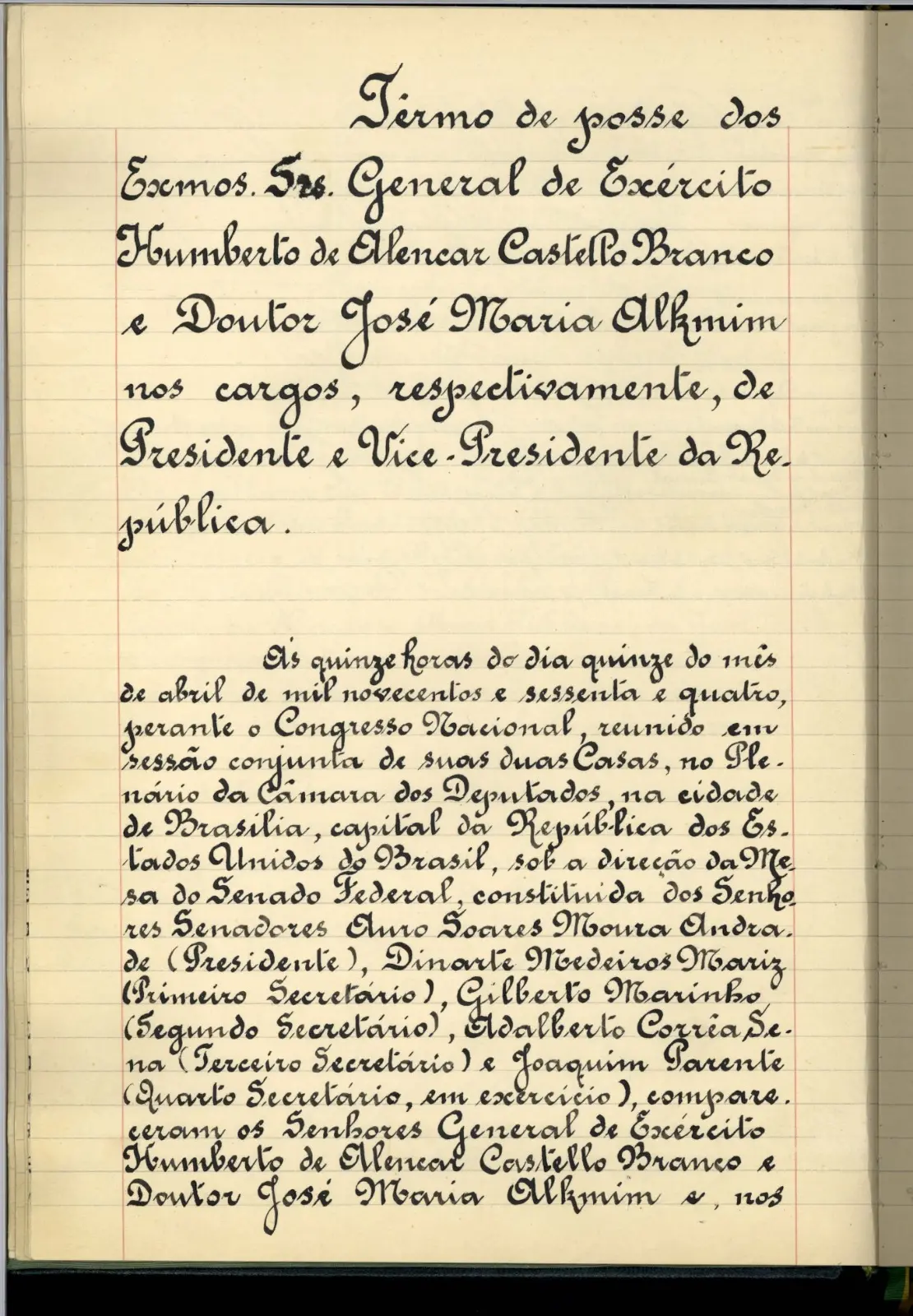 No dia 15 de abril, o militar cearense tomou posse em Brasília. Era o início da ditadura que durou 21 anos. Naquela data, Castelo proferiu um discurso que, no decorrer dos anos ditatoriais, se evidenciou pelas promessas não cumpridas e as contradições. Ao ser empossado, o cearense jurou defender a Constituição, reiterou a promessa de entregar o cargo em 1966 e destacou ser um defensor das “liberdades democráticas”.