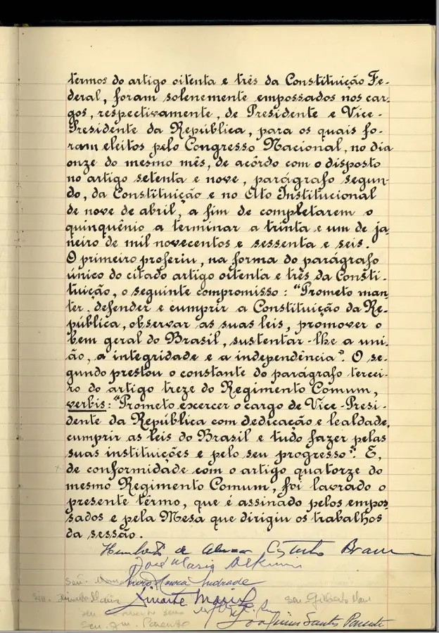 Castelo também ressaltou que iria defender e cumprir “com honra e lealdade a Constituição do Brasil” e que “seria escravo das leis do país e permanecerei em vigília para que todos as observem com exação e zelo. Meu Governo será o das leis”.