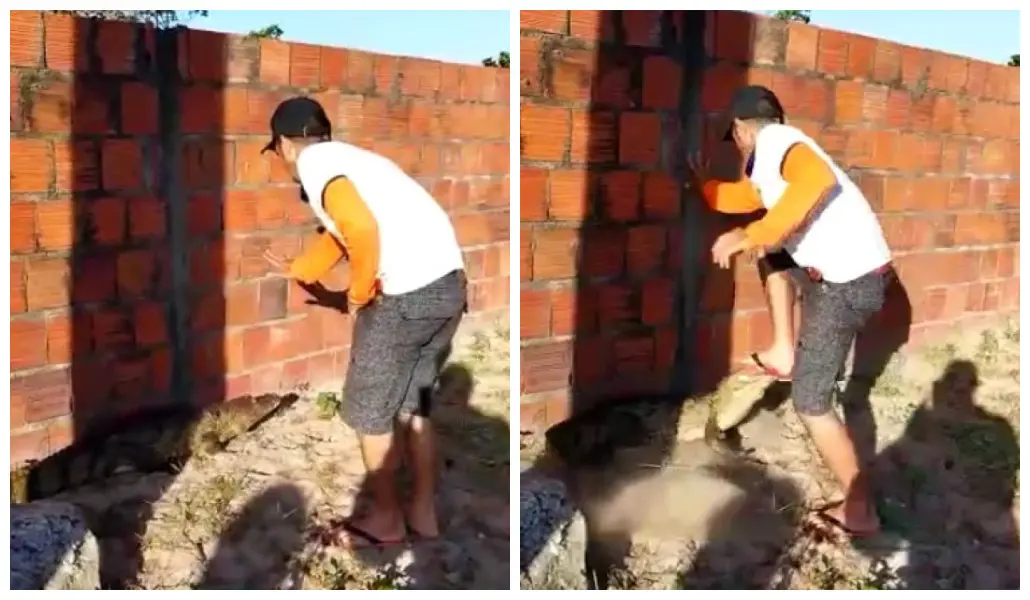 Moradores do bairro Parque Santo Antônio registraram o momento em vídeo. As imagens mostram o animal acoado enquanto o homem se aproxima e tenta imobilizá-lo com o pé, quando é surpreendido pelo bicho, que tenta se defender.