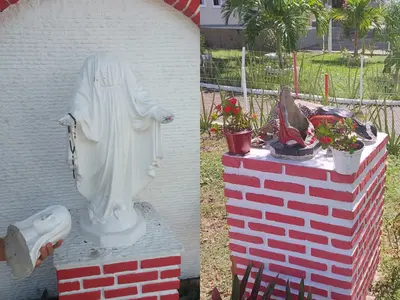 Ao menos três imagens sacras que ficam na parte externa da Igreja de Santa Luiza, no bairro Jardim das Oliveiras, em Fortaleza, foram parcialmente destruídas na madrugada deste domingo (5). O vandalismo foi descoberto quando membros da Igreja chegaram ao local na manhã deste domingo.