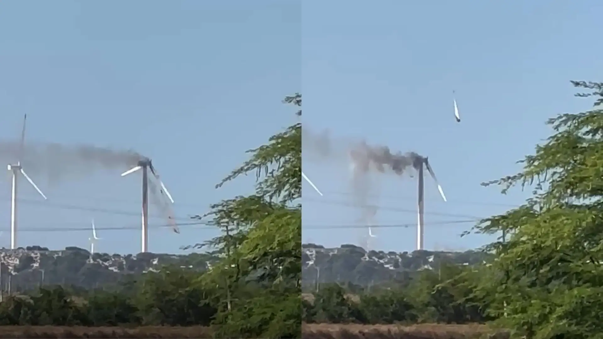 Nas imagens registradas pelos moradores, é possível ver a torre eólica em funcionamento durante o incêndio. Em seguida, duas pás se desprendem e caem.